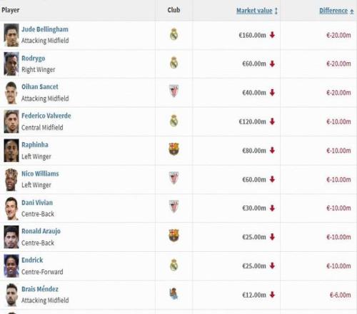 西甲身价跌幅前十