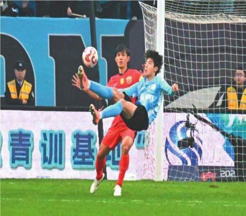 图③:英博海发队球员朱鹏宇(前)倒钩射门。 本报记者 孙海涛 摄